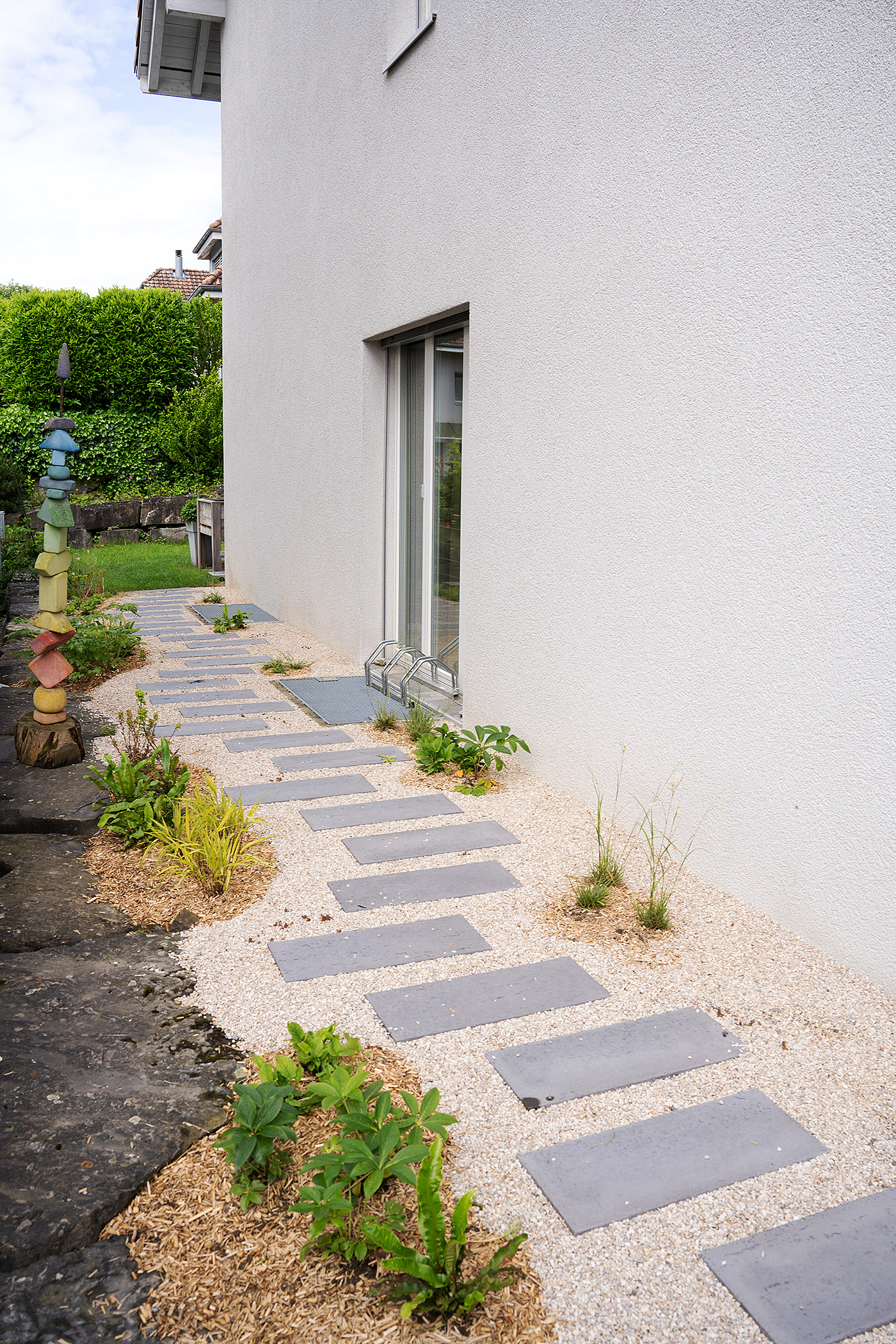 Ein schmaler, kaum genutzter Rasenstreifen wurde zu einem einladenden Gartenweg, der Licht und Struktur in den Aussenraum bringt. Mit gezielten Eingriffen entstand ein Bereich, der den Eingang mit dem Garten verbindet und den ganzen Zugang deutlich aufwertet.